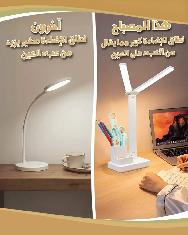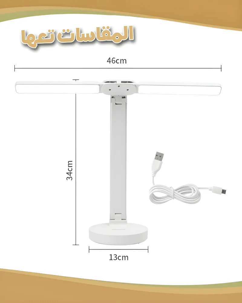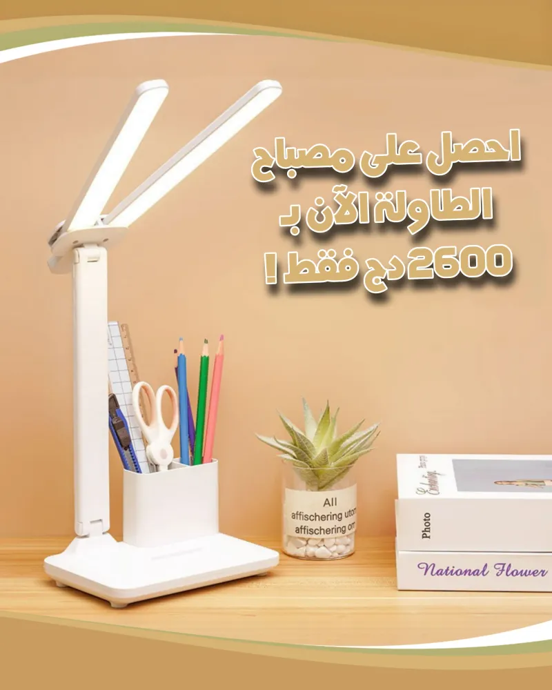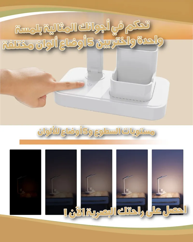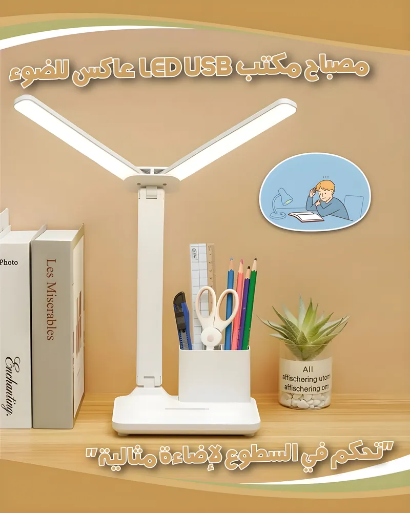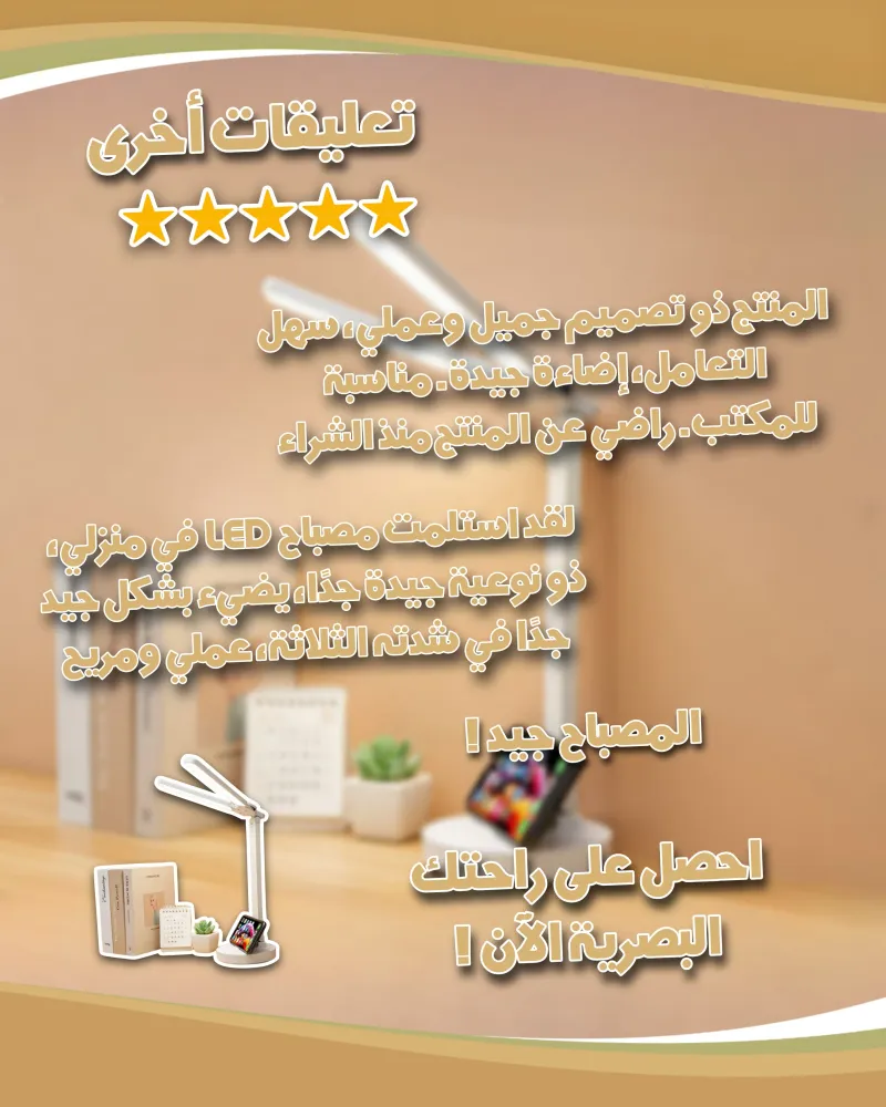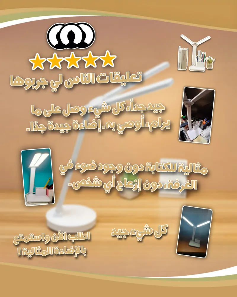 "✨ مصباح مكتب LED USB قابل للتعتيم بلمسة واحدة! 💡 يوفر إضاءة ناعمة ومريحة بفضل تصميمه القابل للطي ⚡. يمكنك التحكم في السطوع واختيار 5 أوضاع ألوان مختلفة 🌈، مثالي للدراسة، العمل أو القراءة 📖. تصميم أنيق وعصري يلائم كل المساحات ✨."